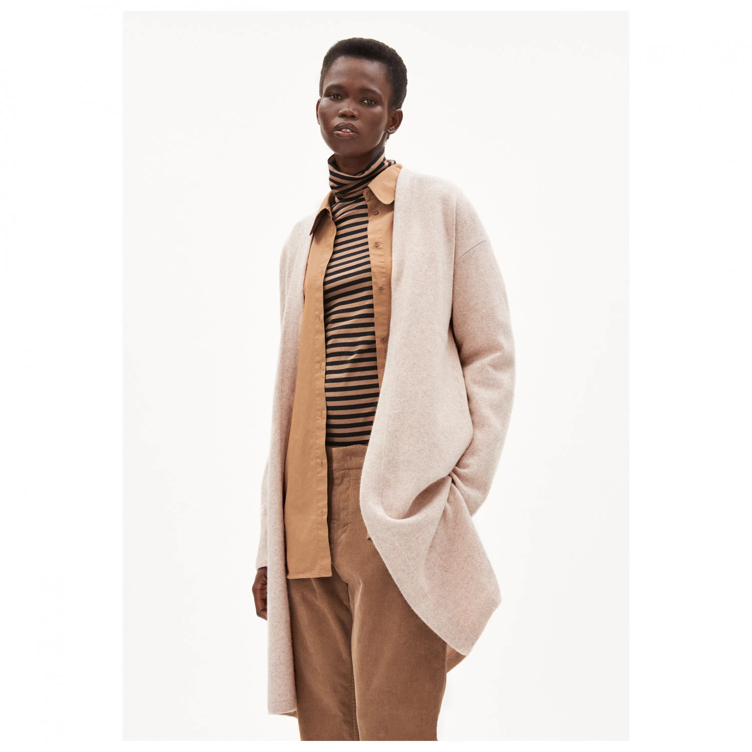 Die Women’s Maertaa Wolljacke von ARMEDANGELS passt sich perfekt an und ist wie gemacht für den zeitlosen Lagenlook! Lang und weit geschnitten überzeugt sie in geradliniger Form und lässt sich elegant oder lässig stylen – ideal an kühleren Tagen fürs Business-Meeting, auf dem Konzert oder beim Städte-Sightseeing.